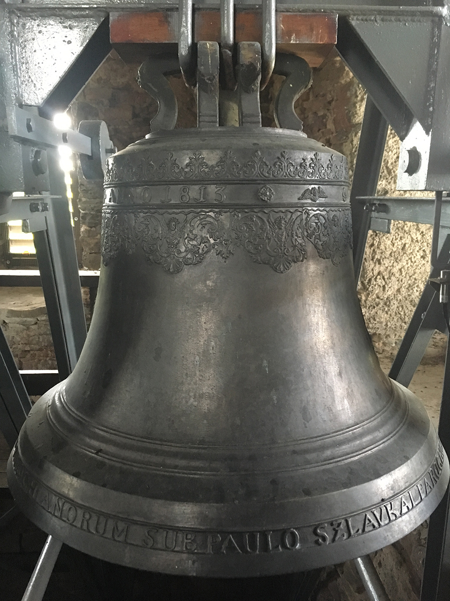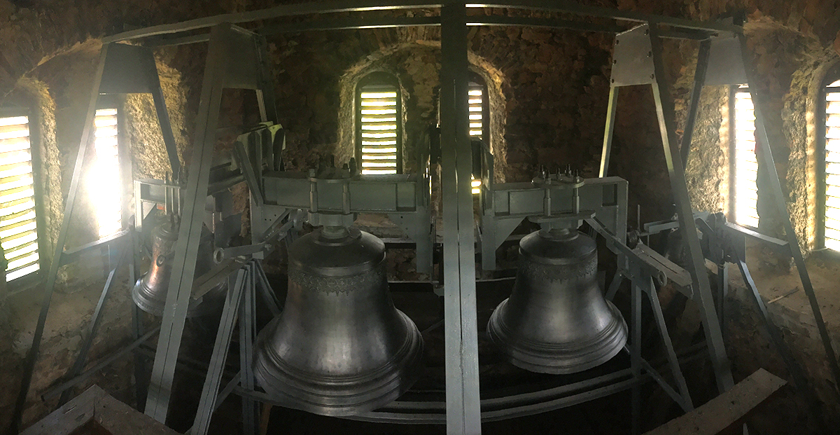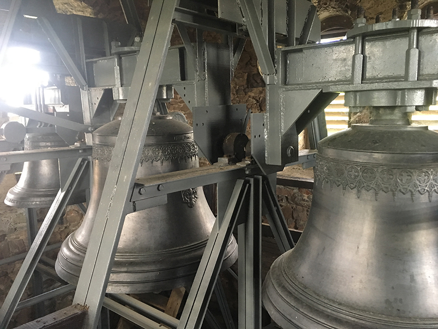Pôvodná nosná konštrukcia štyroch zvonov bola drevená. V druhej polovici 20. storočia sa konštrukcia vymenila za oceľovú a osadila do kamenných múrov veže. Je samonosná. Zvonenie bolo elektrifikované na reťazový pohon. V roku 2010 sa reťazový pohon zvonov vymenil za pohon lineárny. Pri tejto rekonštrukcii boli zvesené všetky štyri zvony a namontované na nové závesné zariadenia. Najväčší zvon bol odliaty v roku 1924 a zasvätený Najsvätejšej Trojici. Váži 750kg. Druhý zvon bol odliaty tiež v roku 1924 a je zasvätený Božskému srdcu Ježišovmu. Váži 500kg. Tretí zvon je z roku 1813 a váži 300kg. Je zasvätený sv. Jánovi Nepomuckému. Tento zvon je najstarší, čo je možné vidieť aj na jeho korunke. Pri poslednej rekonštrukcii v roku 2009 bol z malej vežičky nad svätyňou prenesený štvrtý zvon do voľného poľa v závesnej konštrukcii zvonov. Váži 70kg. Je zasvätený sv. Floriánovi a bol odliaty v roku 1919.