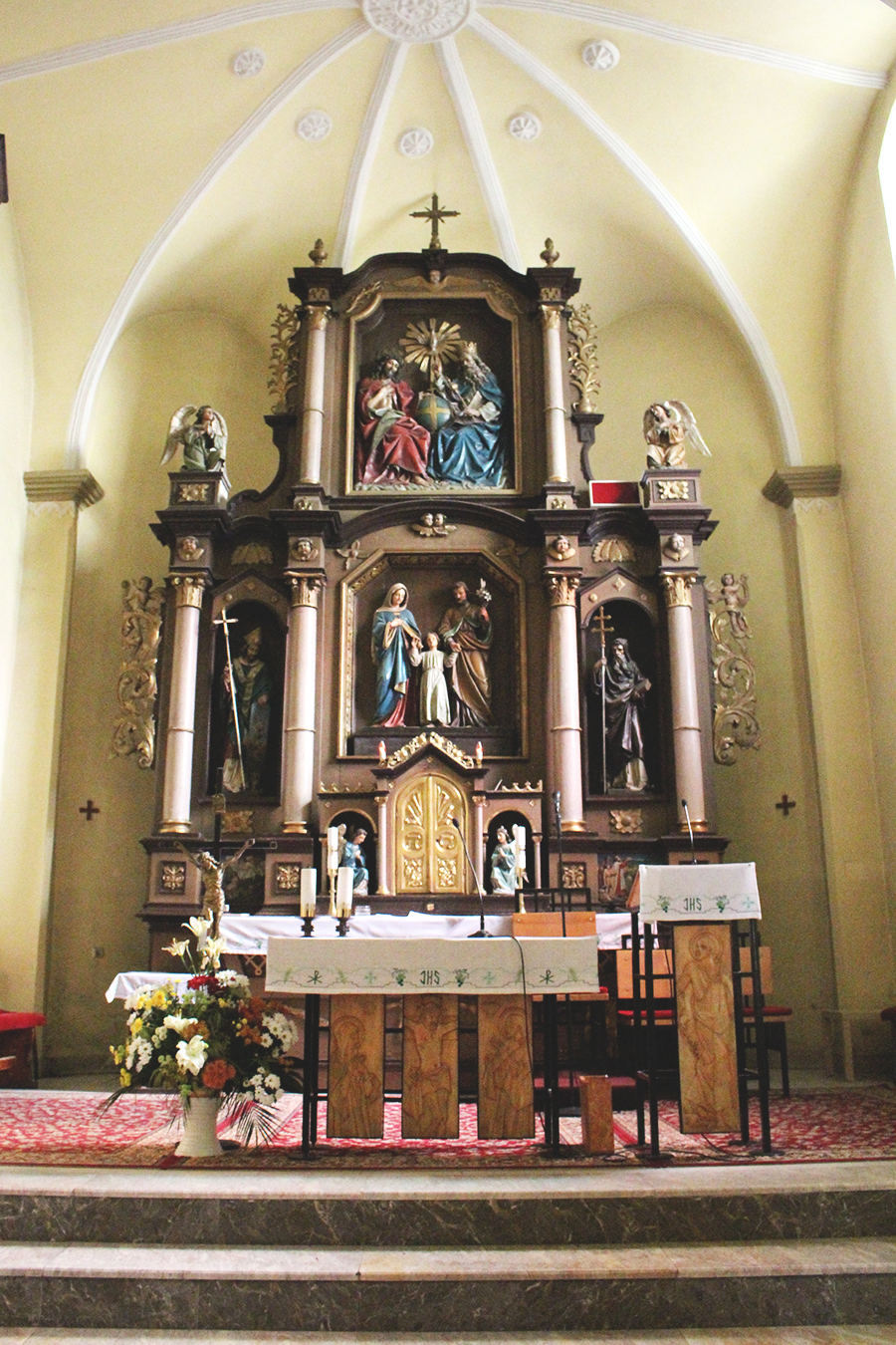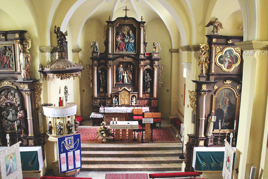 Hlavný oltár tvorí polychrómová drevorezba zo začiatku 19. storočia. Autor tohto oltára, ako aj ostatných, je neznámy. Oltár má kamenný základ, oltárna menza je oproti pôvodnej veľkosti zmenšená o polovicu, v strede s tabernákulom s dvoma adorujúcimi anjelmi. Zvláštnosťou je stred oltára, kde nezvyčajne nie je Najsvätejšia Trojica – ktorá je v tympanone, ale Svätá rodina.