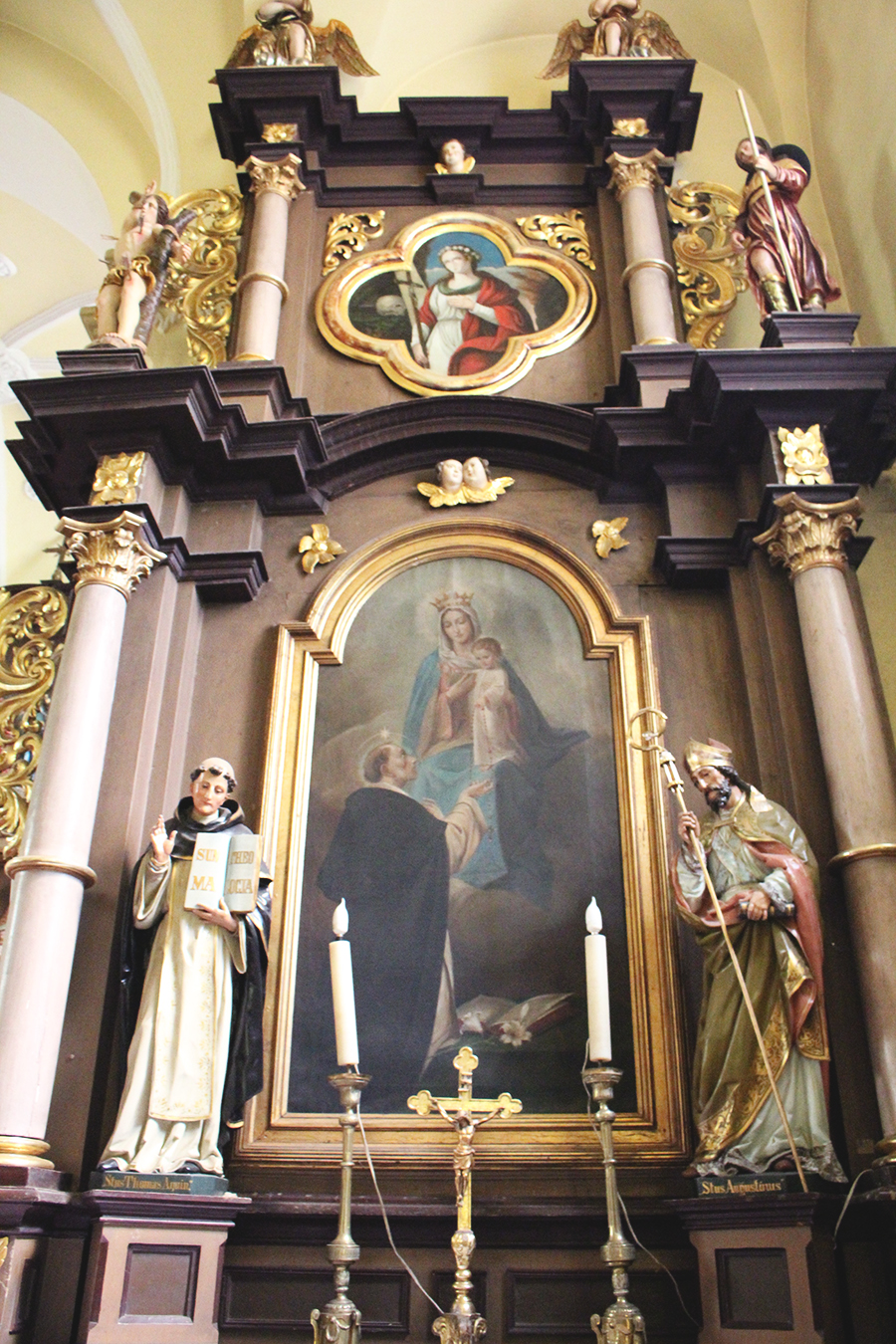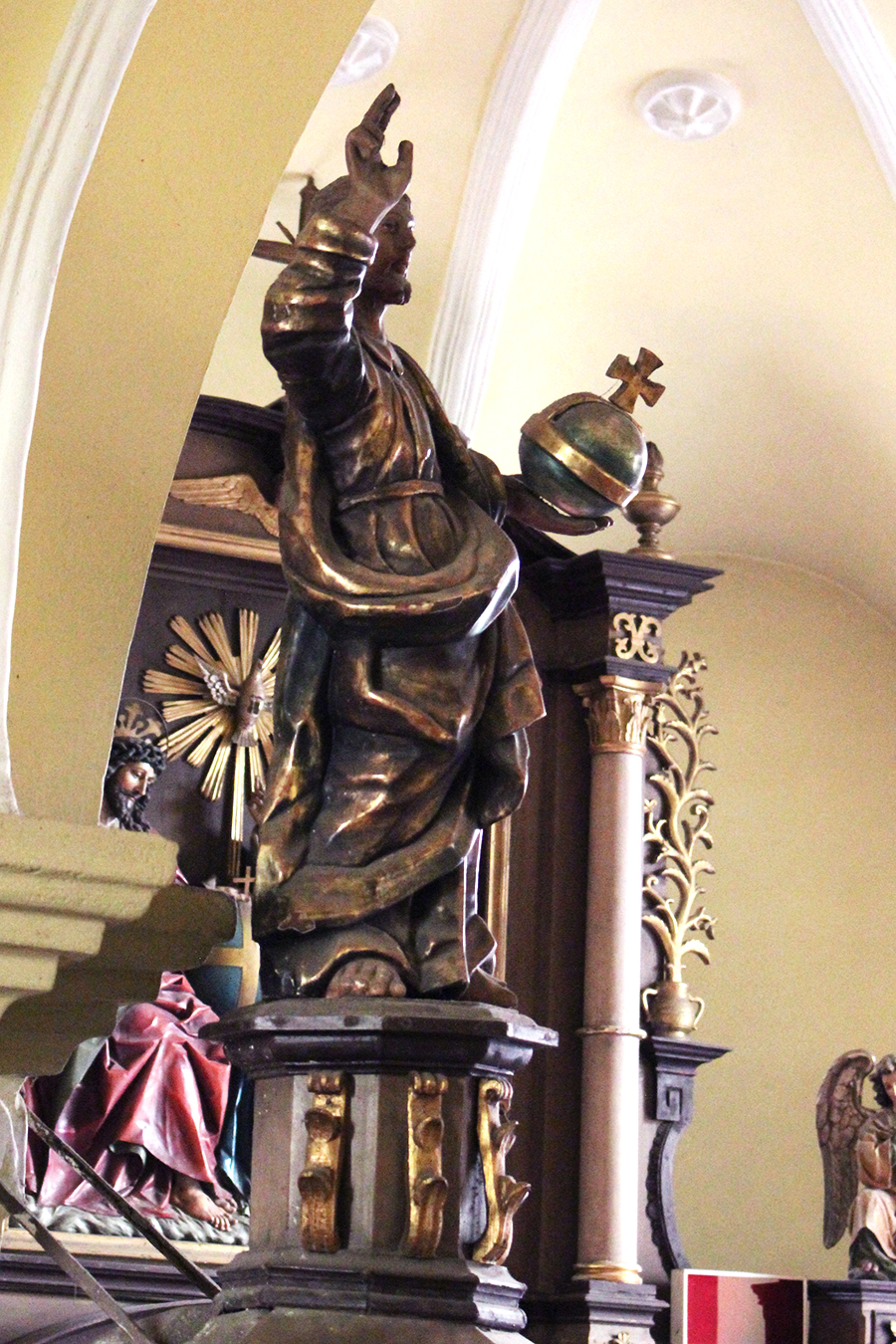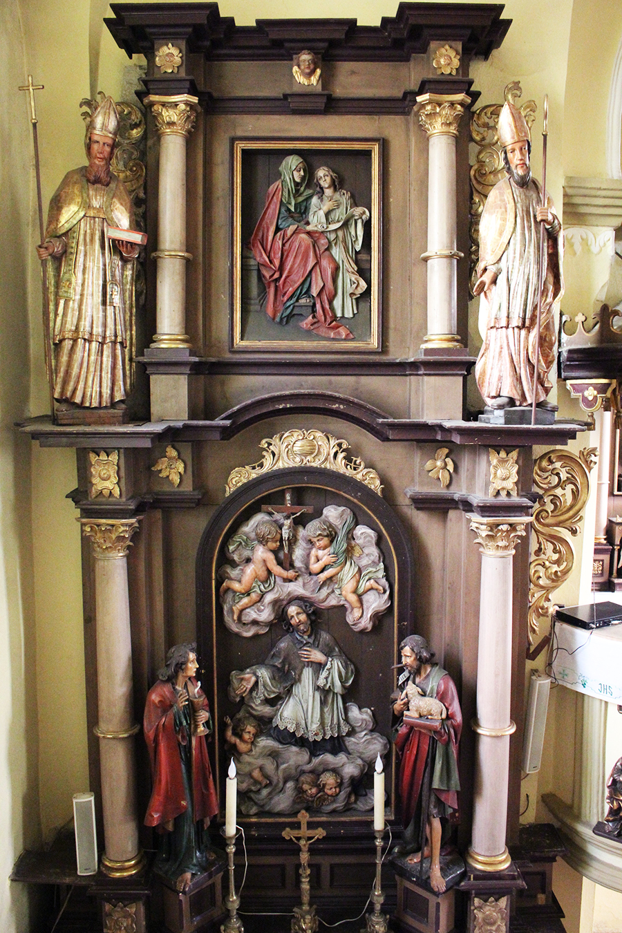 Dvaja biskupi (sv. Augustín?) v hornej časti sú z obdobia ranného baroka a pochádzajú z staršieho, možno pôvodného hlavného oltára.