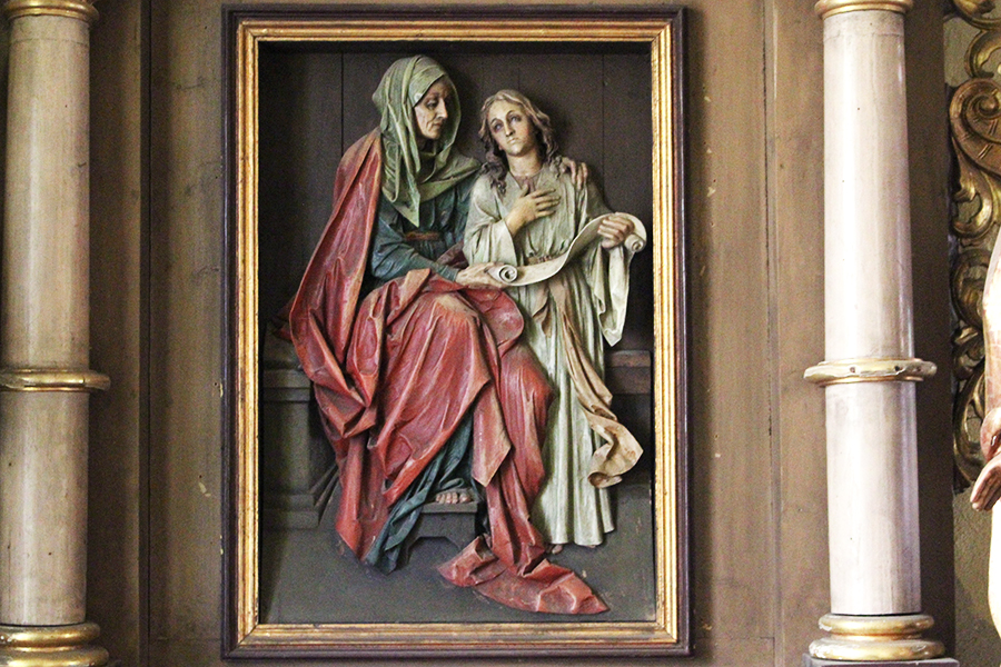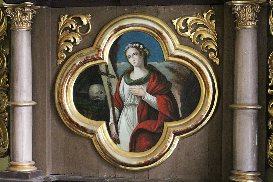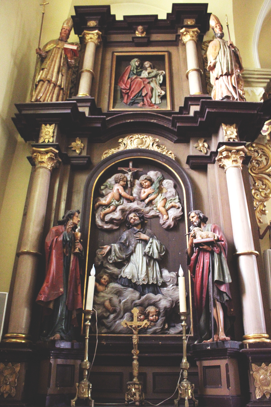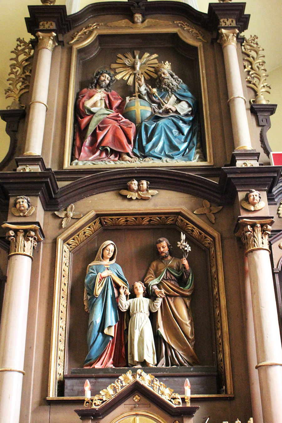 Dvaja biskupi (sv. Augustín?) v hornej časti sú z obdobia ranného baroka a pochádzajú z staršieho, možno pôvodného hlavného oltára.